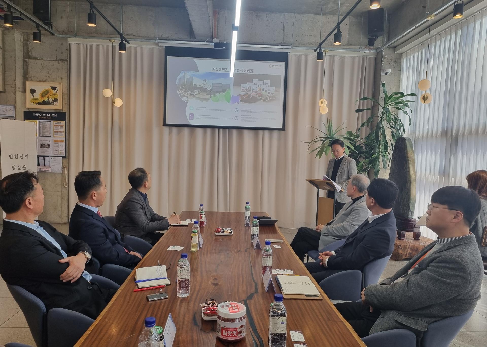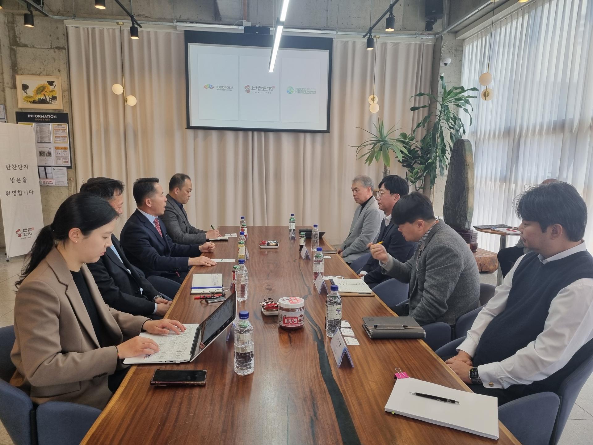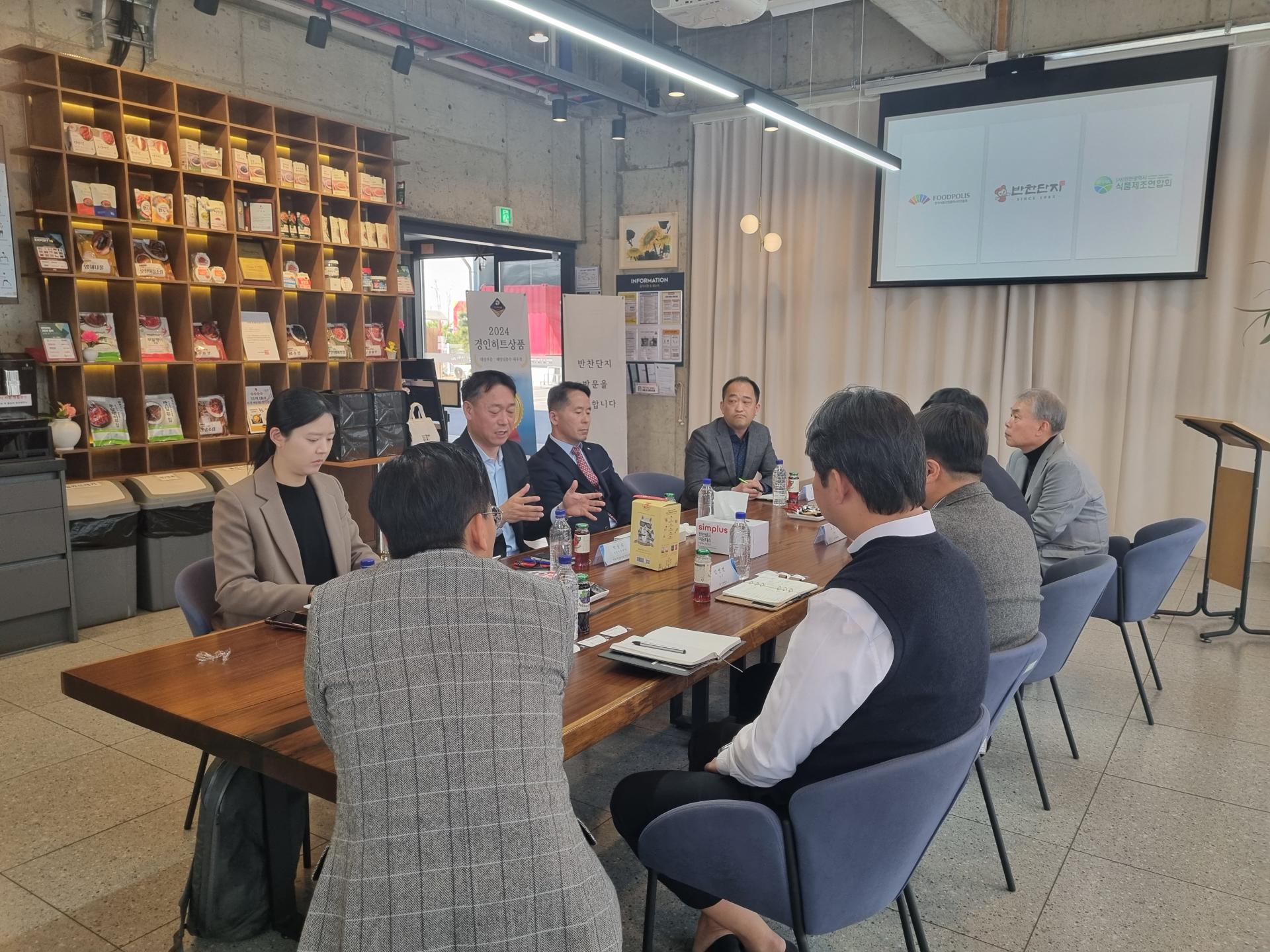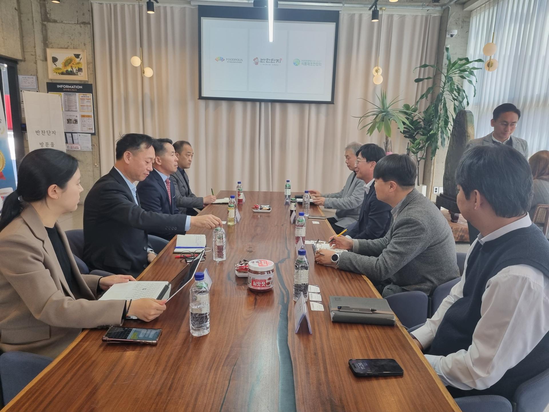 3월 28일(금) 오전 11시 (주)반찬단지에 한국식품산업클러스터진흥원 김덕호 이사장님과 박승수 처장님, 한진수 차장님이 방문하여 연합회와 진흥원 소개 시간과 상호 협력 방안을 위한 간담회를 가졌습니다. 우은명 연합회장님은 식품산업 지원사업에 대해 김덕수 이사장님께 문의하며 다양한 채널을 통해 식품산업이 활성화 될 수 있게 해달라고 요청하셨고 특히, 고령친화 식품에 대한 논의가 심도있게 이루어졌습니다.